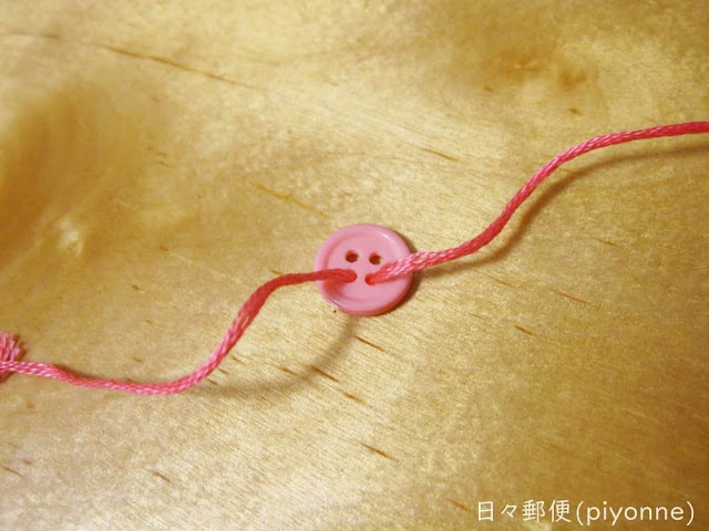 左下の穴から出ている糸を右上に通し、封筒ごと貫きます。